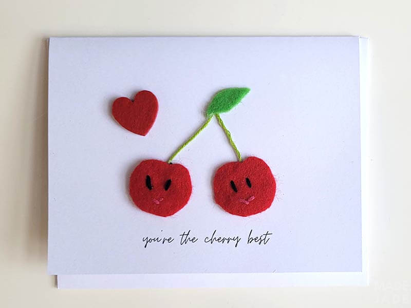Each card is individually printed and finished with felt accents, then hand-stitched with faces to give it a unique personality. Handmade by Jade on the Sunshine Coast, BC.