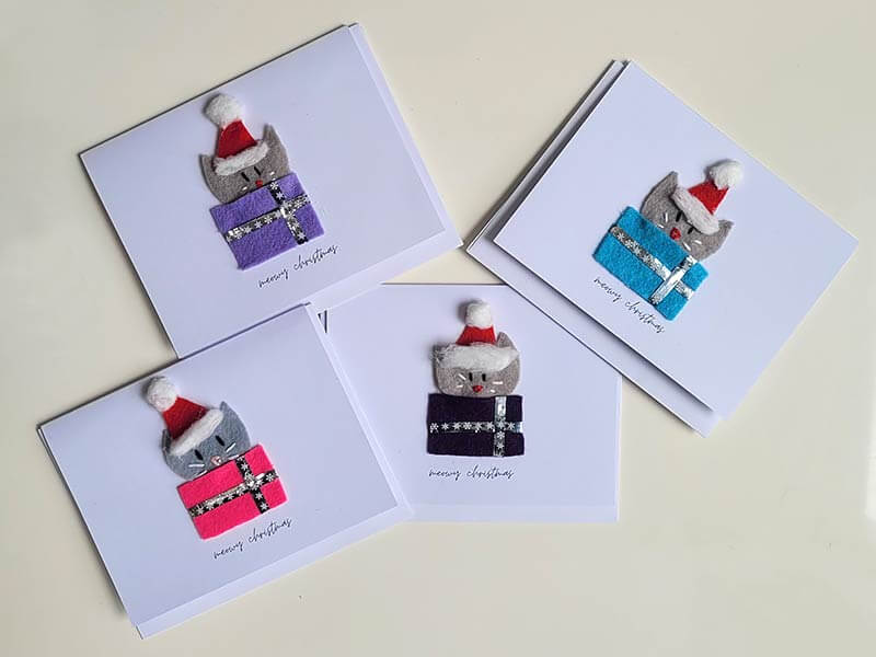 Note: Each cat, present/ribbon and santa hat is handmade and original, so colours and details may vary. When checking out, use the comment box to share any colour preferences.